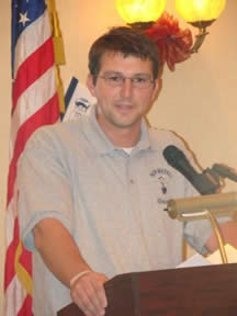 CRSCBL Commissioner Bob Bob Douglass, Commissioner of the Cal Ripken Sr. Collegiate Baseball League, spoke about the Mid-Atlantic Classic All-Star game between his league and the Valley League, which will be held in Waldorf, Maryland on July 15. Bob traveled all the way from Baltimore to be with Rebel fans, providing them with interesting background about the game. Admission to what will no doubt prove to be exciting collegiate action is free, but donations are encouraged. If you can't make it to the game, MASN will broadcast the contest in HD. ![]() Lucas Jones previews the 2009 Lucas Jones, the Rebels new manager, had an excellent message concerning what he looked for when recruiting players and how he intended to manage them. Jones told the audience that he recruited players with good skills, a knowledge of the game, and "the most important thing," the proper attitude towards preparing for and playing in the game. He then related how he had planned for each and every day of the 61 day regular season, only to tear up those plans when he learned of the tragic death of family friend, Jeff Taylor, Sr., who was struck by a line drive while throwing his son batting practice. Jones stated that this event illustrated the importance of taking nothing for granted and that he and the Rebels would "play in the moment, pitch to pitch. We will live the present moment . . . and enjoy the time we have." A wonderful philosophy whether you're between the lines or in the stands. This year's banquet saw the highest attendance yet. All money raised by the Grandstand Managers goes to the support of baseball in the New Market area. Thanks to the Shenandoah Valley Grandstand Managers Club for a wonderful time! |